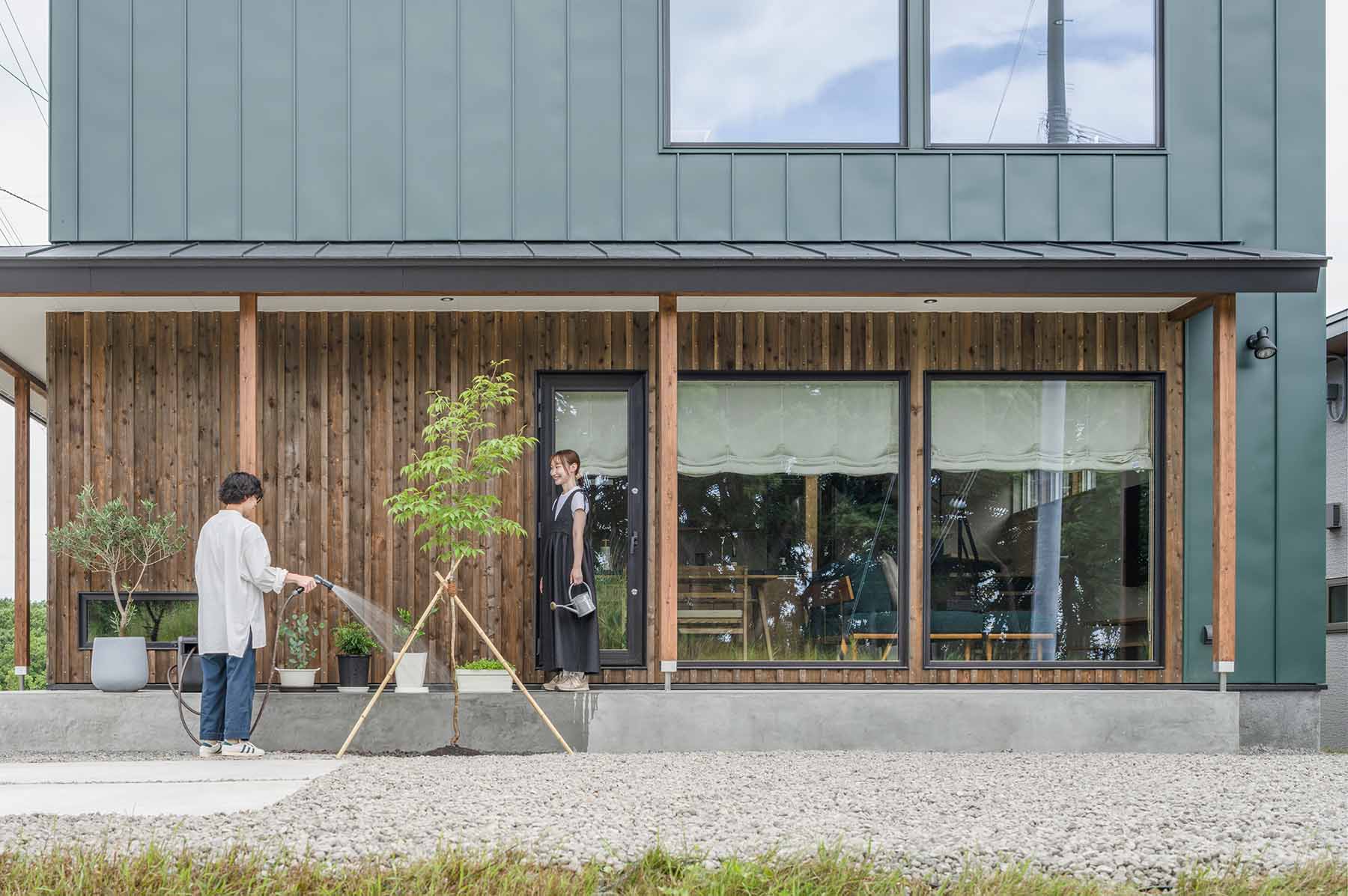 深いグリーンのガルバリウム鋼板の外観が印象的なSさん宅。土間は腰かけるのにちょうどいい高さで、「家の中でもあり、外でもある」縁側的スペースとして活用