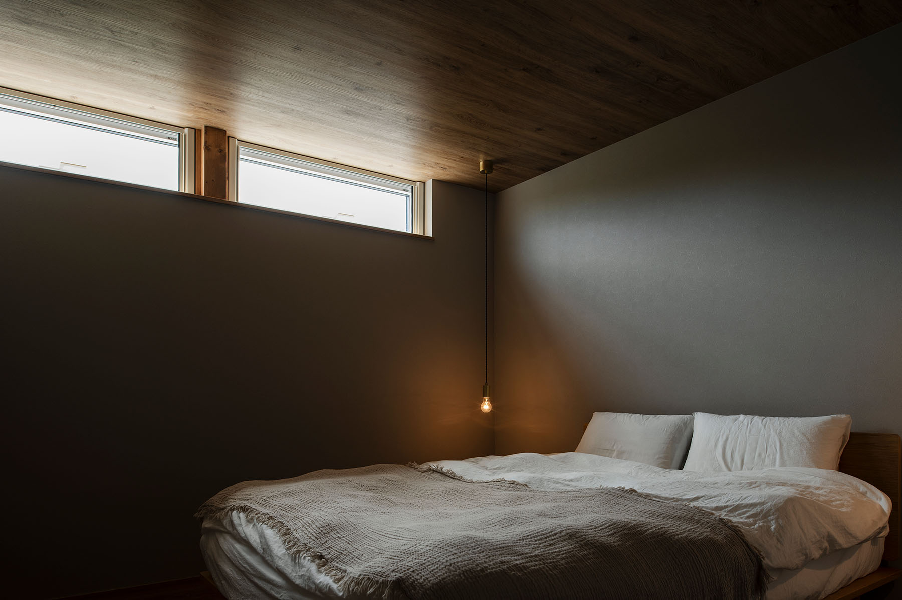 木をふんだんに使った家にしたいと考えていたSさんご夫妻。窓枠や天井などに用いた木材、現しにした梁でその希望を叶えた。照らしたい所だけを照らすために、吹き抜けの天井から1階のダイニングテーブルまで照明を吊るしている