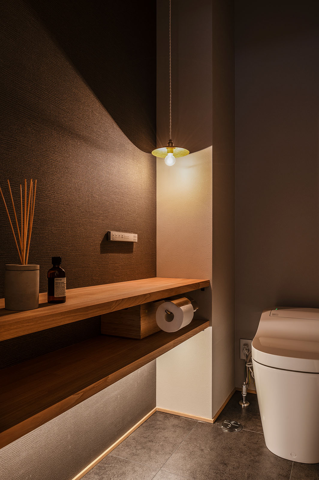 トイレの照明も低い場所に一つのみ。こだわり抜いた照明はすべてSさんからの支給品