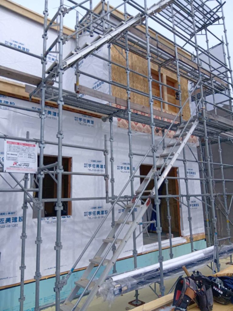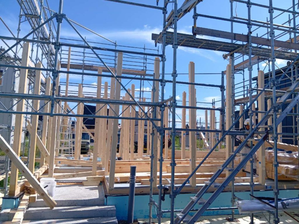足場が組まれ、いよいよ大工作業の開始です!