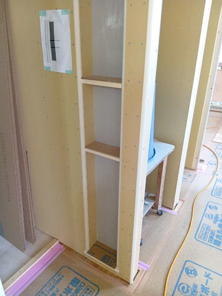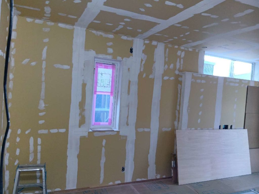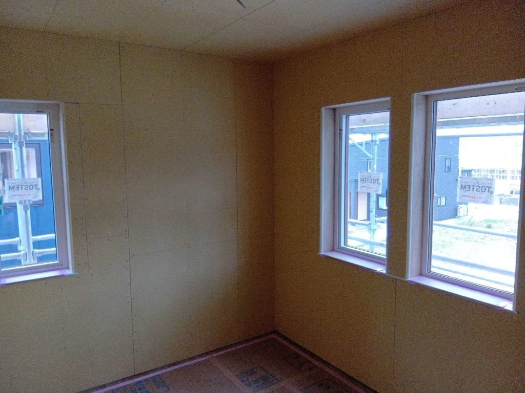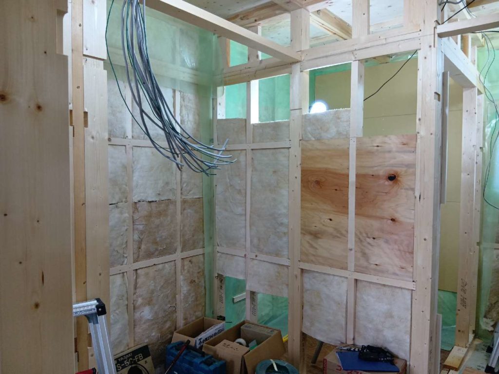 壁の断熱材を入れポリフィルムを張り付けた後に、ボードを張っていきます。