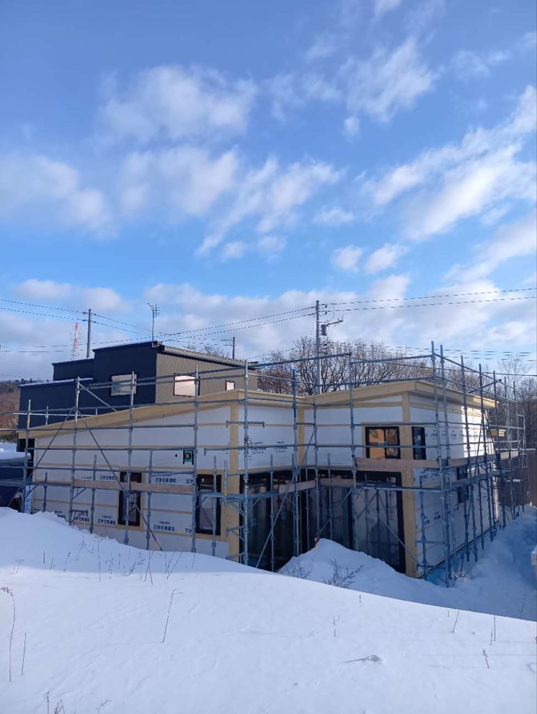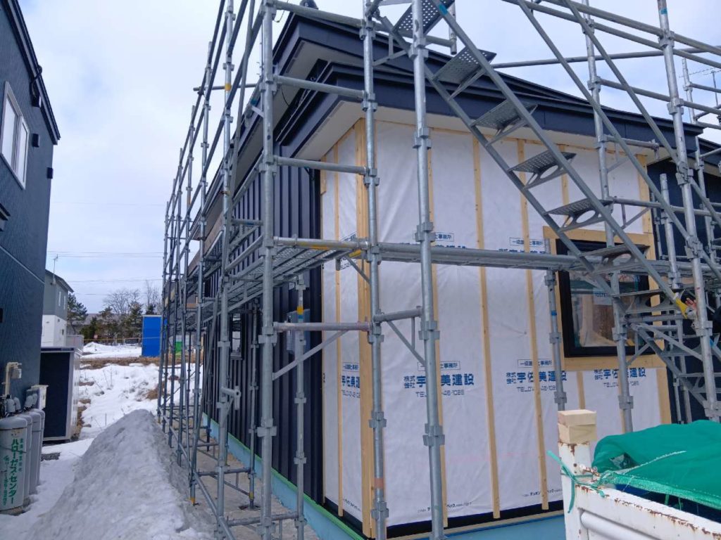 お天気に恵まれ、雪解けが進む中 外壁の板金張りを行っていました。