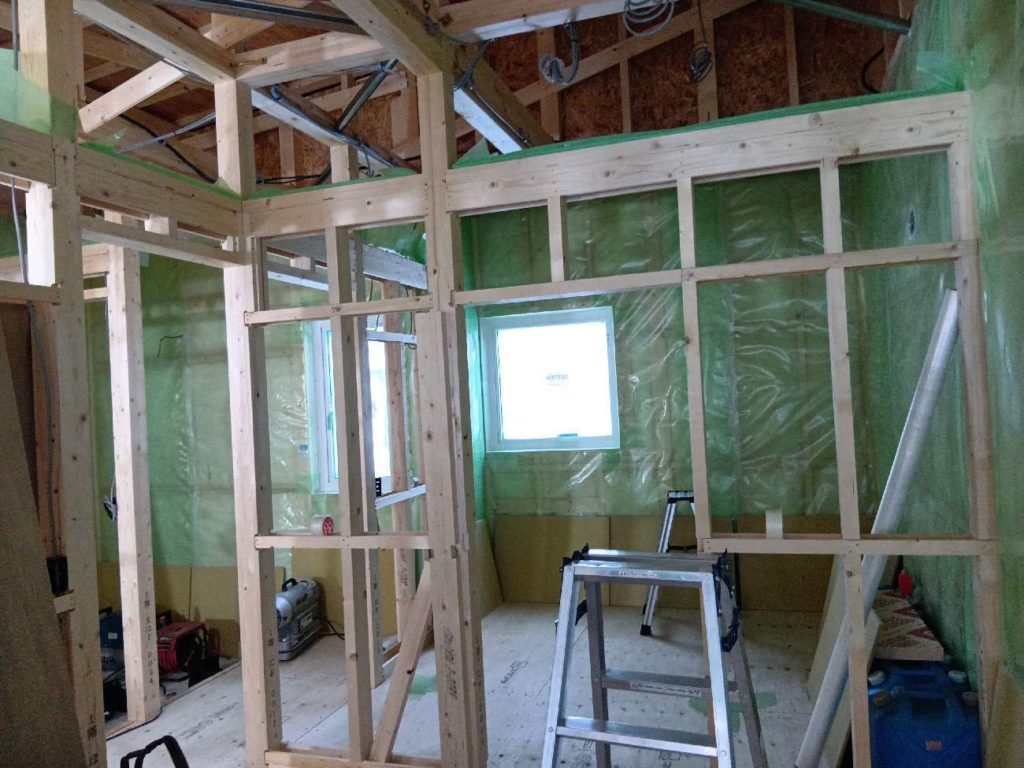 断熱施工が完了して気密シートの施工中。