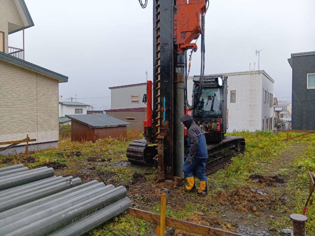 まずは地盤改良の為に、コンクリートの杭を圧入していきます。