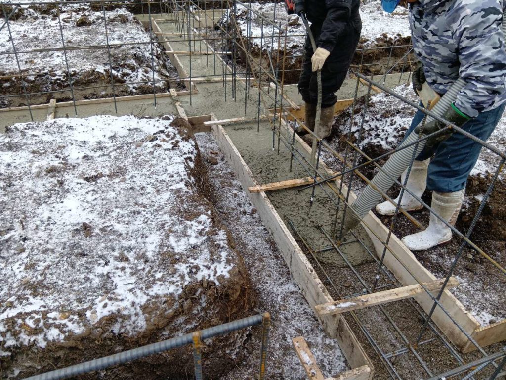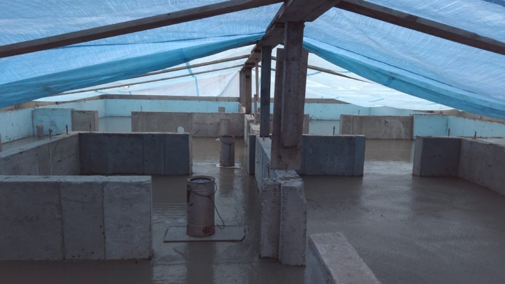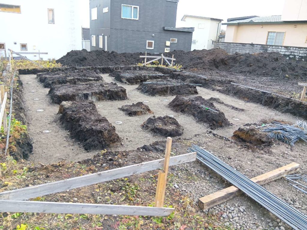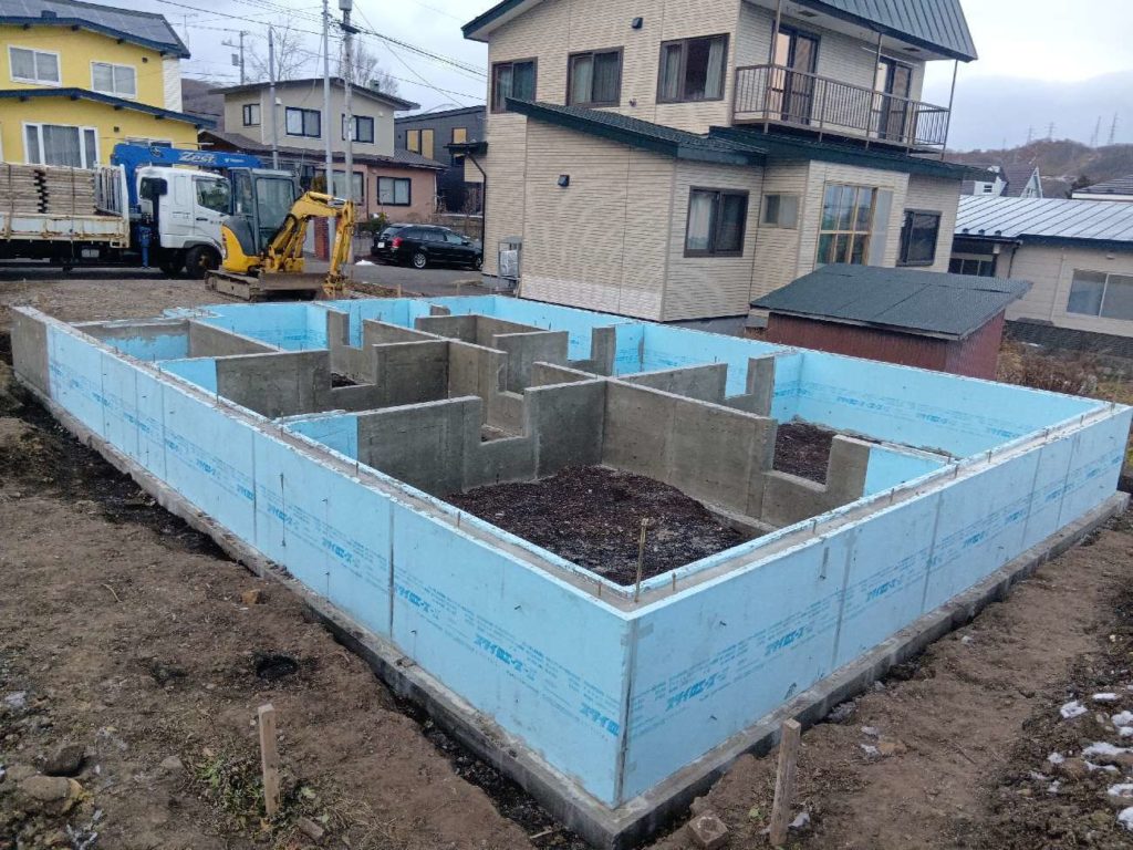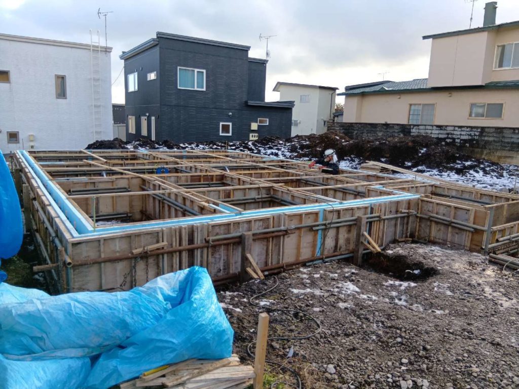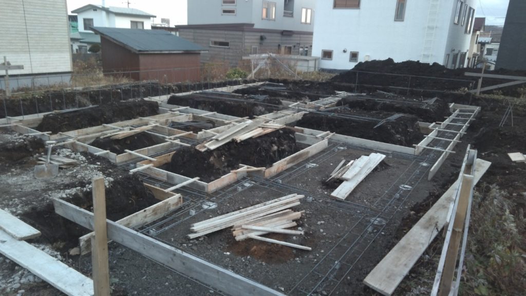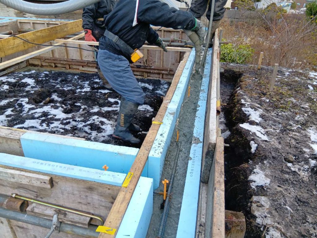 土間コンクリートを打設するまえに防湿用のビニールを敷き込み→ワイヤーメッシュの敷き込み→玄関部分と土間配筋を行った後、土間コンクリートの打設を行い完成です。
