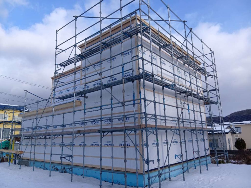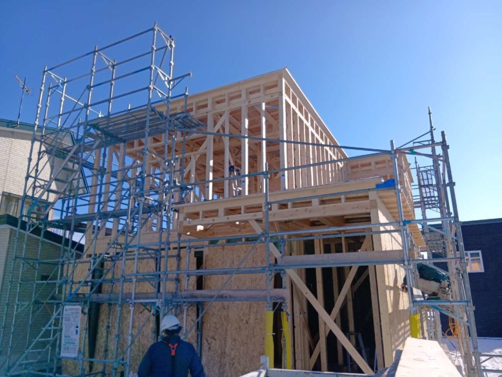 構造用面材の施工が進み、外観がはっきりとして来ました。