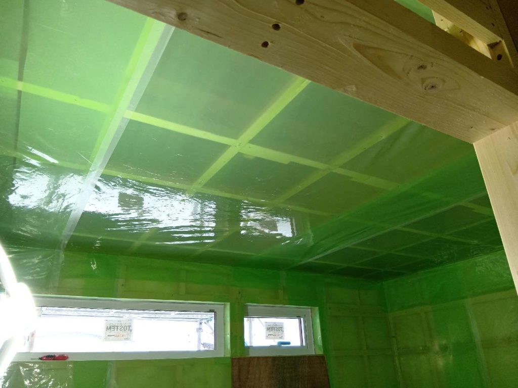 前回までに断熱材が入れ終わったので、気密シートで覆ってしまいます。