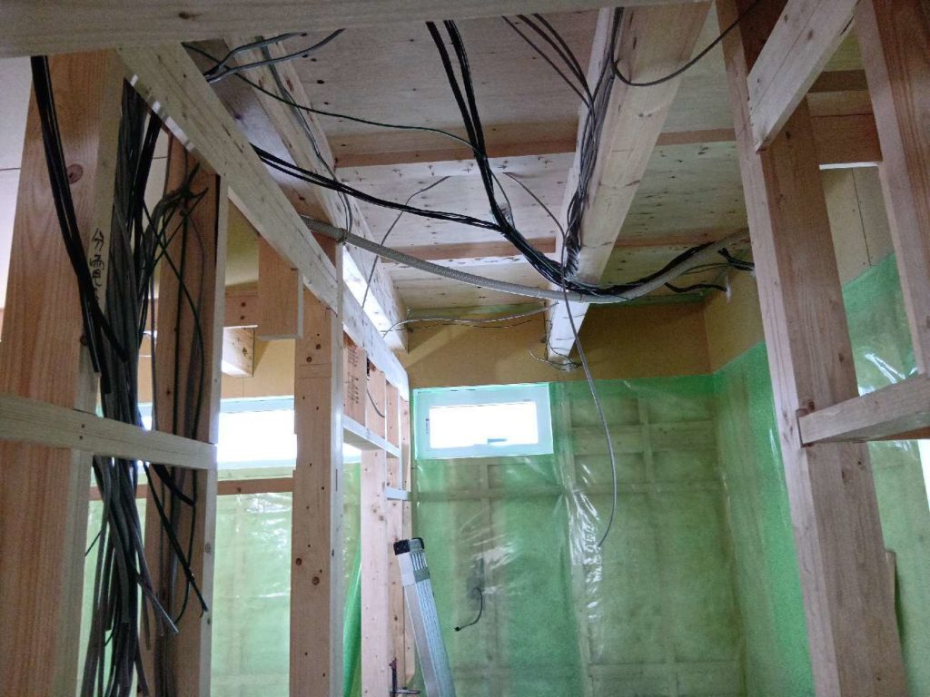 石膏ボードを張ったら見えなくなってしまうので、今しか見えない電気配線たち。