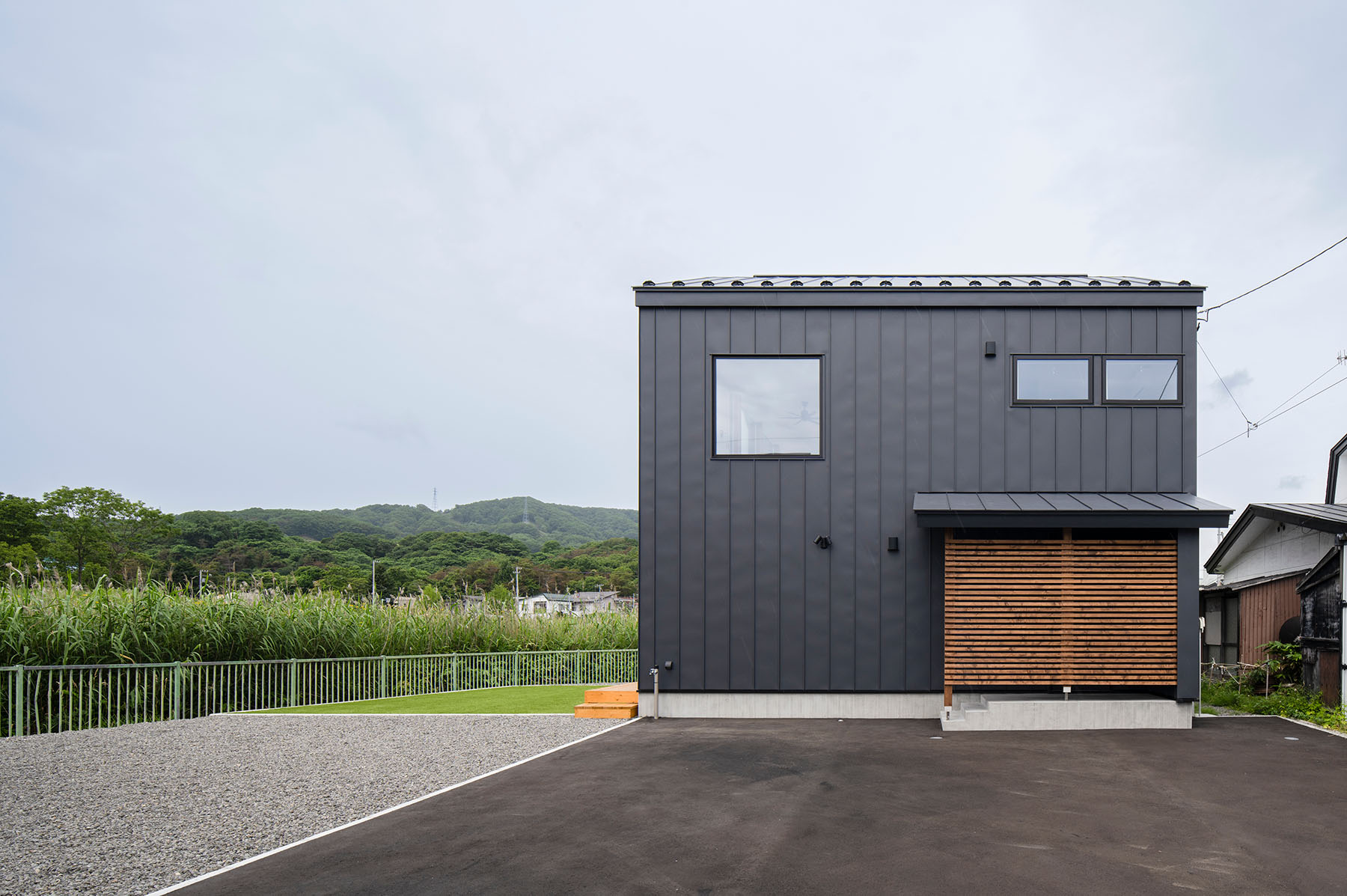 エントランス側の外観。ガルバリウム鋼板をメインに使用し、スギ板を主とした正面側とは雰囲気を変えている