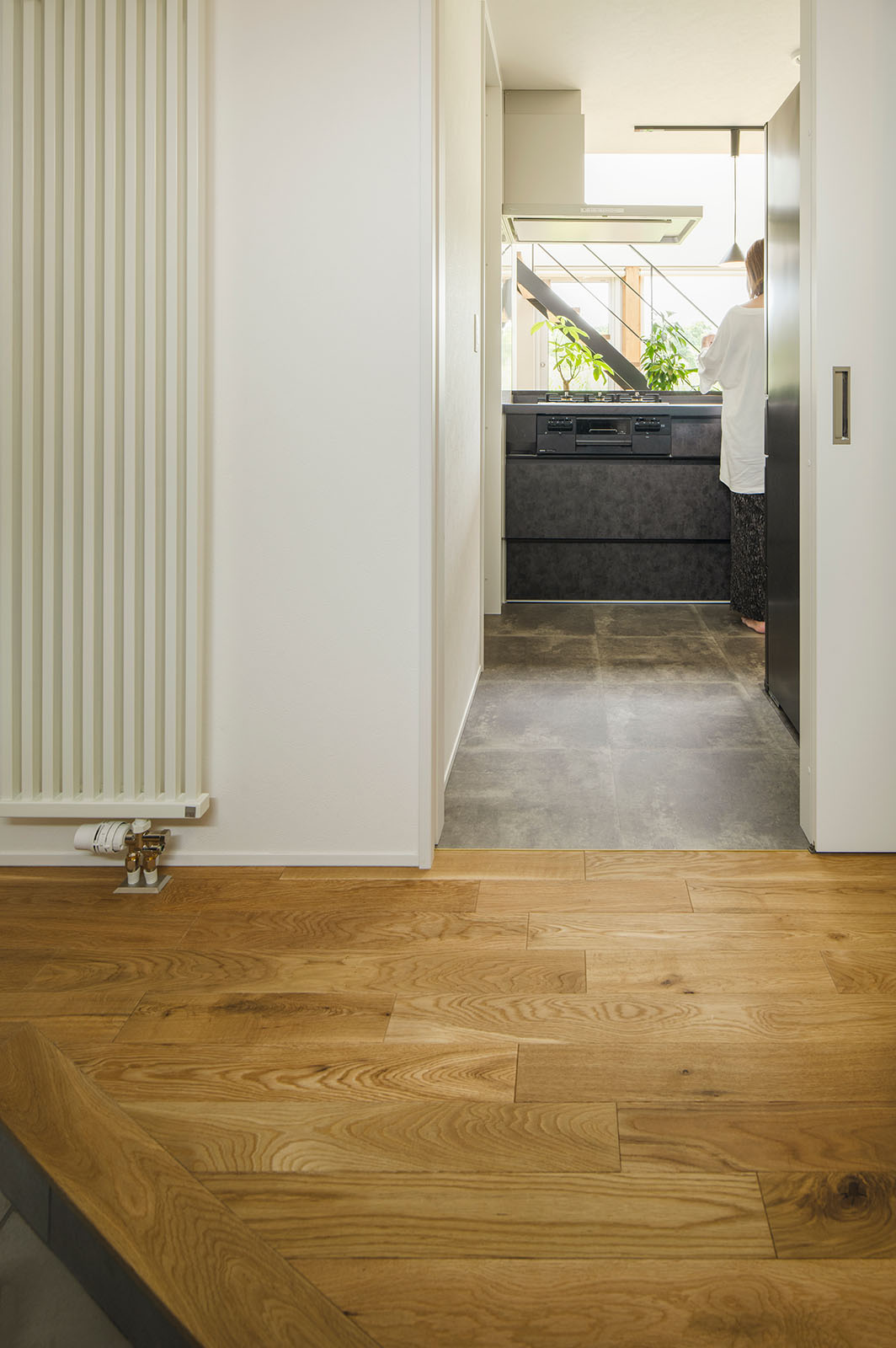 階段裏スペースを利用して、ウッドデッキへの出入りのための土間を設けた。スケルトンの階段下ということもあり、植木を置くなど、想定よりも使い勝手のいいスペースになっているそう