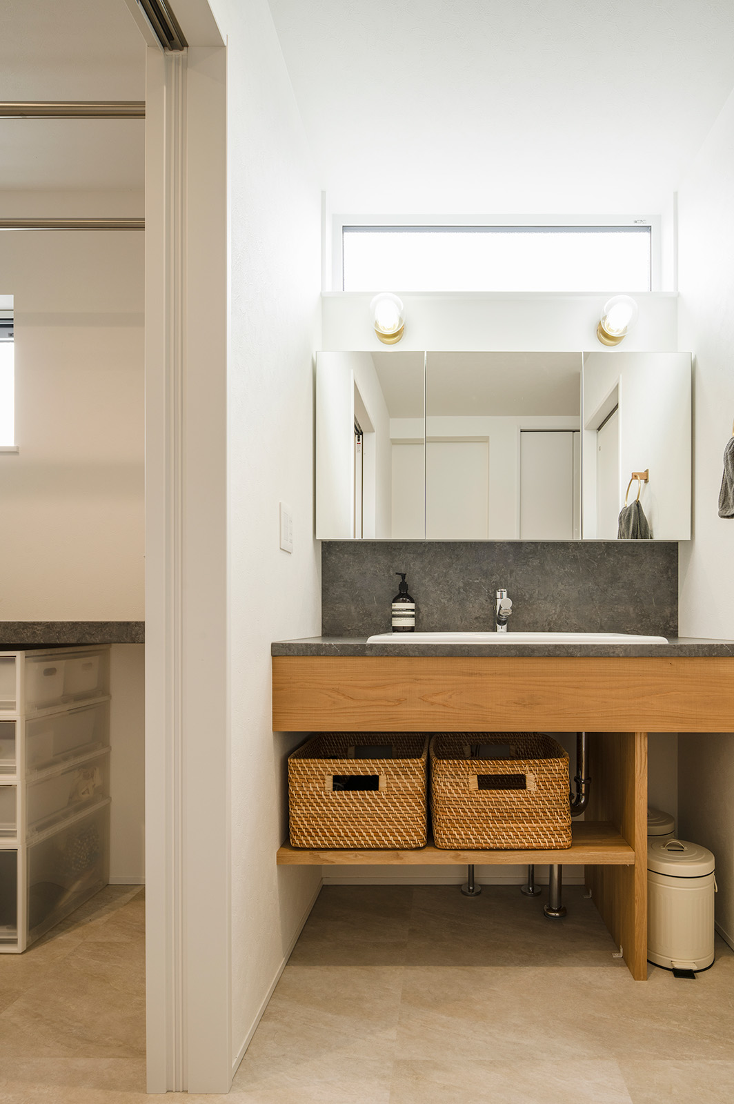 玄関とパントリーが近く、カウンターキッチンとダイニングテーブルはつながっていて…と考える中で、当時妊娠中だった奥さんのお腹の赤ちゃんが女の子だと分かりました。新たな家族の一員となる娘さんがお風呂上がりにゆっくりドライヤーを使えるように、ユーティリティと洗面スペースを分けることに。ホールの先にある脱衣室とトイレに挟まれた形で洗面台を独立して設置しました。そうしたことで、来客時にも玄関からまず洗面所に向かい手を洗ってもらい、それからリビングへという動線が完成しました。