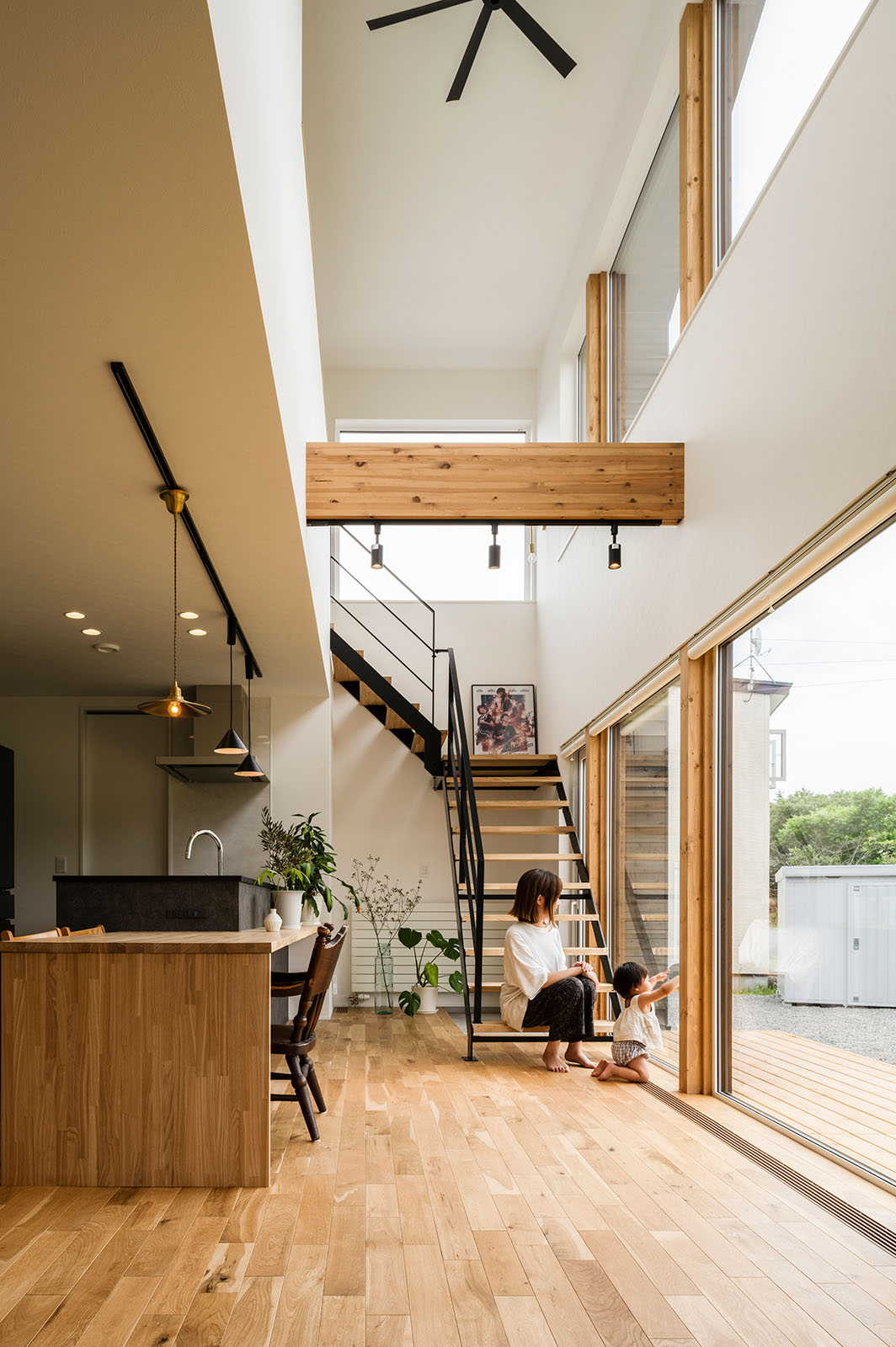 吹き抜けが開放的なLDK。窓からの景色を見ながら調理ができるキッチンには、造作で一体型のダイニングテーブル&カウンターを設えた
