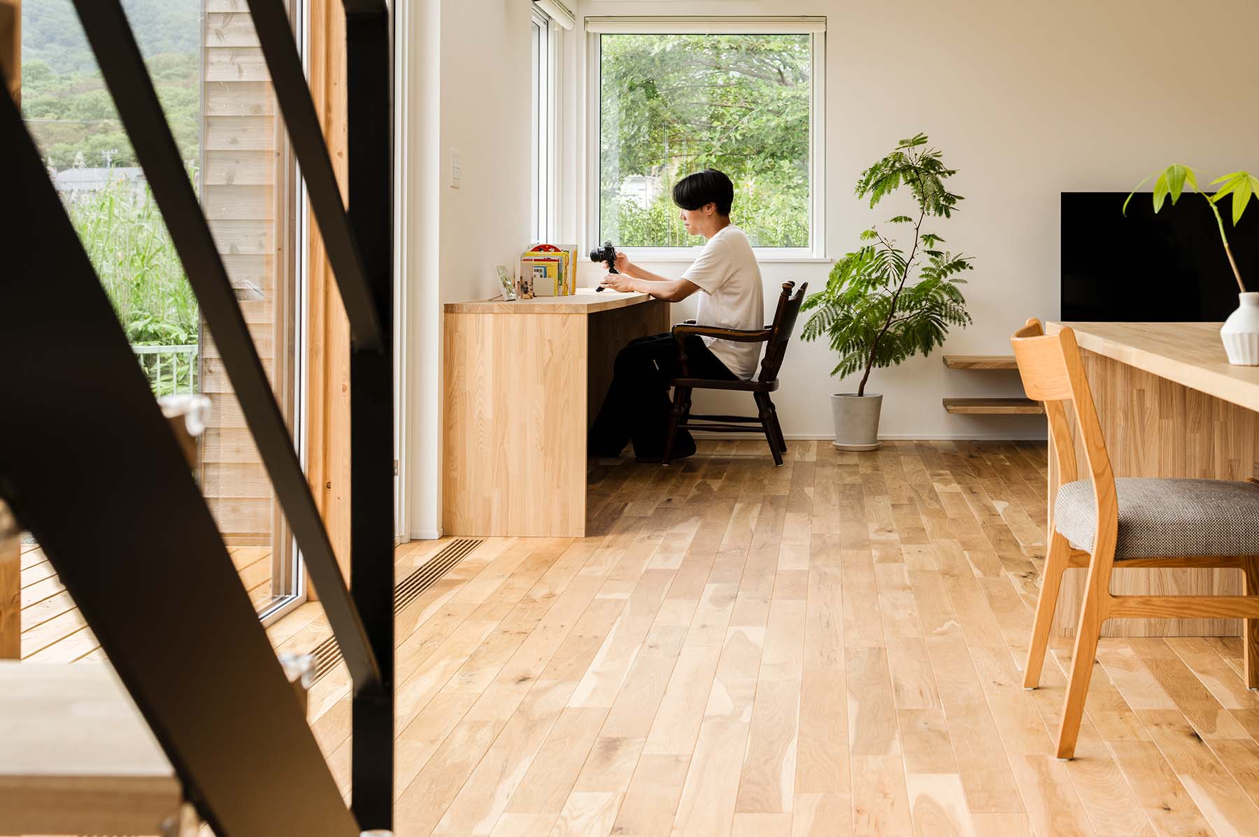 西側は山が見える方角だったことから、収納スペースの予定を変更して窓に。景色を見ながら作業ができる造作カウンターを設けた