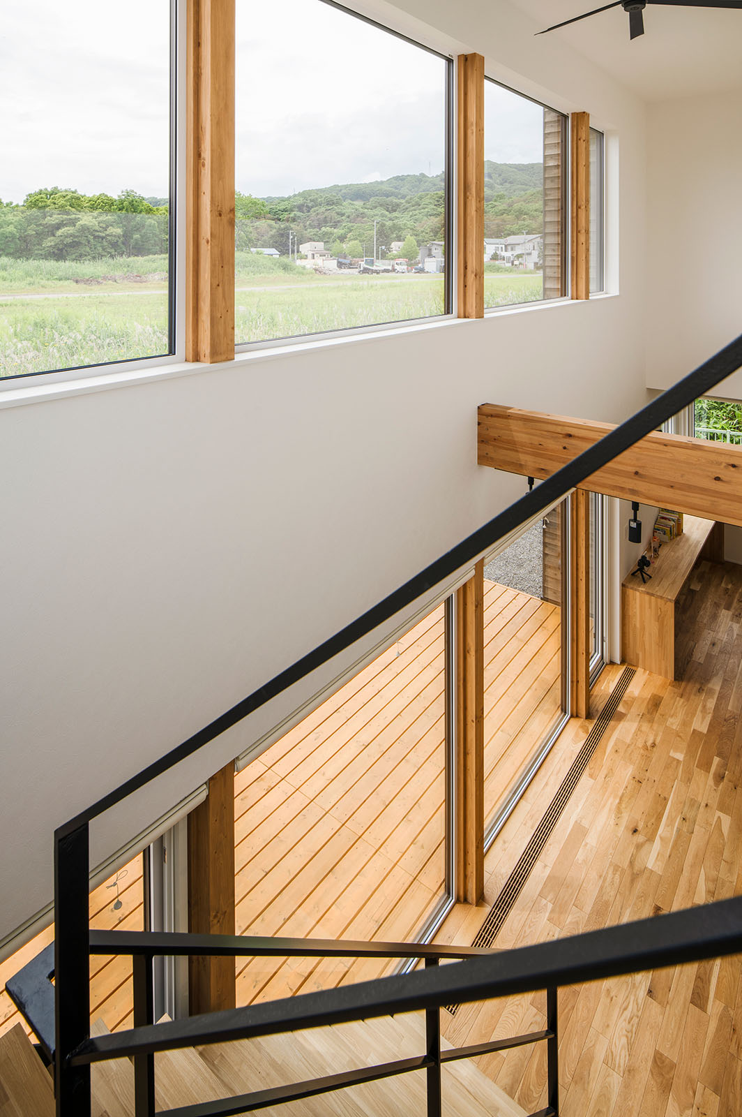 窓と窓の間の柱を壁紙で覆わず現しにすることで、横につなげて見せる視覚的効果を狙った。ウッドデッキの板は室内の無垢フローリングと同じ向きに並べ、室内の延長の空間という雰囲気に