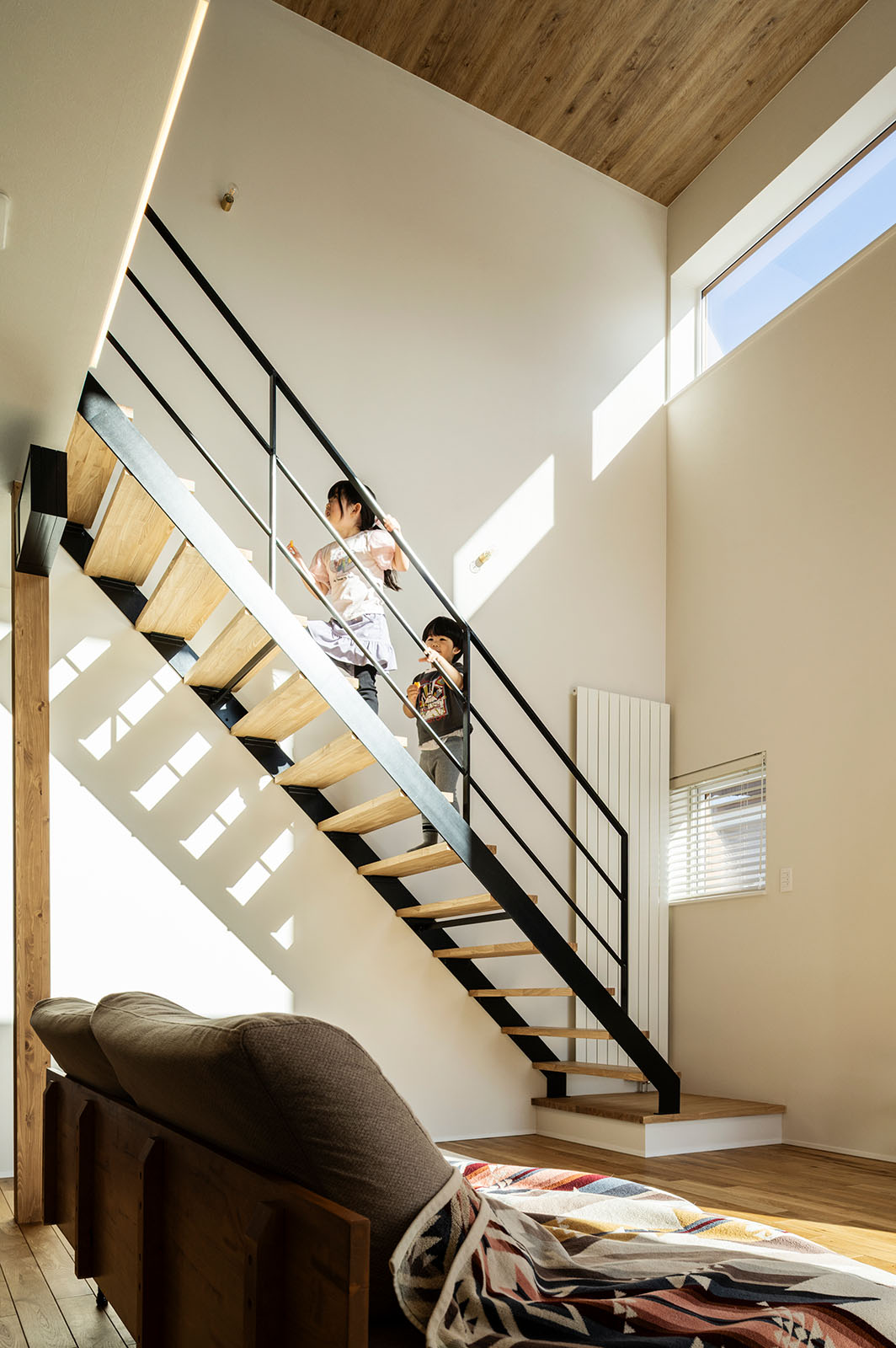 2階への階段はリビング内に。スケルトン+アイアンの手すりで圧迫感を軽減